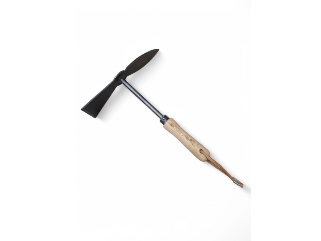 Motyčka rovná srdcová KRUMPHOLZ JUNIOR s jasanovou násadou délky 10 cm. Celková délka nářadí je 20 cm a váží 200 g. Motyková část má délku 18 cm a šířka čepele rovné motyčky je 6 cm.